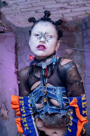 The materials used are: merchandising pieces with their striking advertisements, second-hand work clothes, remnants of stock from the 90s, gloves and sports protectors, outdoor accessories such as backpacks, cameras or accessories for pets, all second-hand. Also remains of fabrics. Metals and chains are mostly founded in flea markets. Some accessories are made of discarded leather from the Argentine leather industry and its adjustable straps made out of second-hand suspenders. Also second hand denim and scraps of pieces from previous collections as well as technological devices.